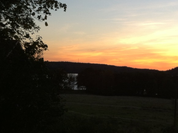 Slängde upp mobilen för att (försöka) visa solnedgången från glasverandan. Vi får alltmera sjöutsikt, allteftersom löven glesnar… Inte dumt!
