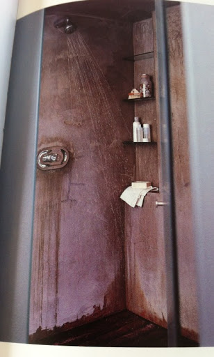 Om ni undrar: Det man ser på bilden är alltså INTE (som jag trodde) det där hörnet i källarn som man får hålla till godo med medan badrummet renoveras, utan ett duschutrymme med ”slimmad elegans”, “med väggar av grovt putsliknande material och ett trägolv som känns mjukt och organiskt under fötterna.”