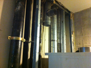 Sen börjar jag fundera: avloppsbrunnen är ju på samma sida som den ursprungliga duschen, framför fönstret, och den kan man väl inte flytta på? Nä, tydligen inte. Därför har man lagt en lös slang framför tvättstället tvärsöver golvet från duschen fram till avloppet… Är det sånt man kallar ”snyggt men inte pråligt”?