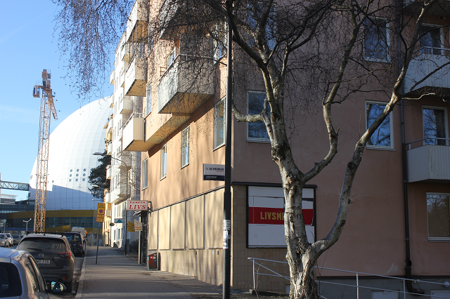 På andra sidan gatan, mellan husraderna ligger fortfarande Skärmarbrinks gård.