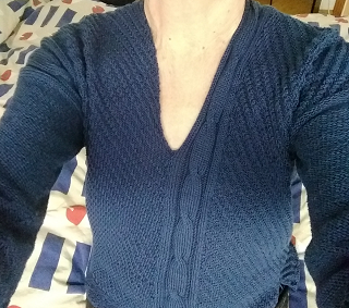 Att sticka en hel tjock manströja med rundstickor visade sig vara OLIIDLIGT spännande: Inte förrän jag hunnit upp till halsen kunde jag kolla om det verkar stämma – och då är det så dags… Annars har jag när jag tvekat om storleken gjort lite smalare fram o bakstycke, så att jag i efterhand kan skarva lagom mycket. Sånt fusk funkade inte här! Svetten lackade och ryggen värkte. Musaxeln gillar INTE att sticka!