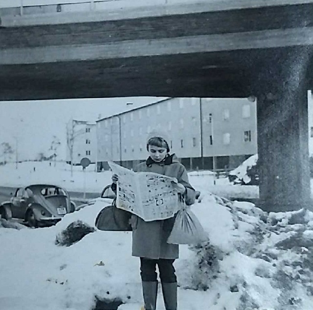 För nu träder jag in i historien! 😃 Vi flyttade till Farsta 1958, men jag fortsatte i min gamla skolan och åkte tunnelbana varje dag, de första åren med den kära gamla matarbussen 185 sista biten från dansbane-stationen. Ibland kom mamma och mötte mig med barnvagn och småsyskon. Här står jag med gummistövlar och gympapåse och har omedelbart lagt beslag på mammas tidning. Gillade att läsa redan då.