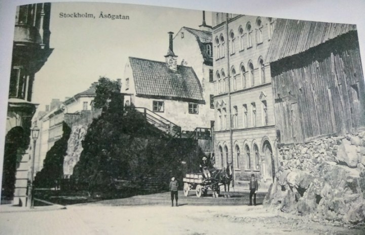 På båda sidor om Åsögatan syns pampiga hus med eleganta fasader, till vänster även trottoar och lyktstolpe. Men det till höger är omgivet av på ena sidan en långsamt  sönderfallande lada uppe på en bergknalle, på den andra en skranglig trätrappa upp till mindre kåkar. Det stora huset ser ut att vara nergrävt mellan de gamla, och det är knepigt att föreställa sig hur man ska kunna spränga bort det kvarvarande berget utan att förstöra de nyare husen. Men det gick tydligen bra, för åtminstone huset till vänster ligger fortfarande kvar. Så här ser det ut idag: