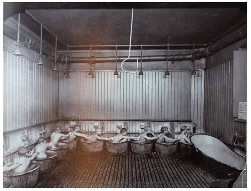1891 infördes skolbad i Stockholms folkskolor, så att barn som inte hade badrum hemma kunde sköta hygienen i skolan. Fotot ovan visar ryggtvätt på Storkyrkoskolan 1903. Ända till 1952 badade min man i zinkbalja i bondgårdens kök. Min familj bodde i Stockholm och hade badrum, men när jag på femtiotalet gick i simskola minns jag att vi fick sitta i småbadkar och skrubba varann på ryggen, precis som på bilden. Fast vi hade hårda rotborstar.