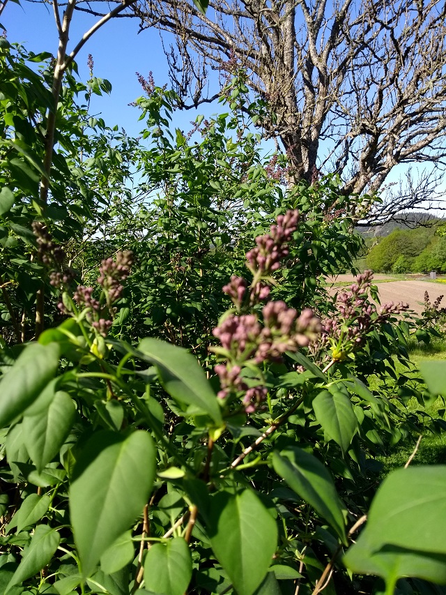 När jag däremot fotar syrenerna, som just är på gång att slå ut, är det tyvärr mobilen som bestämmer var skärpan ska ligga. (Kortet togs igår, idag är knopparna större.)