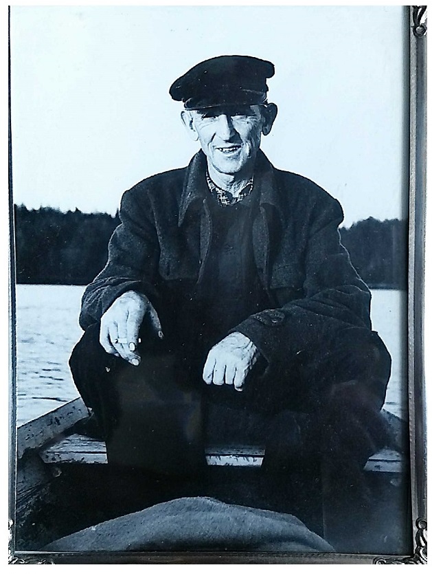 I min bokhylla står bilden av morfar på fisketur, vilket man tydligt ser att han gillade. Tittar man noga ser man också att han på ena handen bara hade tumme och lillfinger kvar, de andra fingrarna hade han blivit av med ”i sågen” hörde jag som barn. De enda sågar jag nånsin sett var handsågar, och jag kunde inte förstå varför han sågat av fingarna istället för veden. Men han stoppade snabbt pipan och rullade cigarretter med de fingrar som var kvar. På finbilden med alla barnen ser jag nu att han håller för den skadade handen. (Möjligen har han bandage? Jag vet ju inte när olyckan hände, för mig var han alltid sån.)
