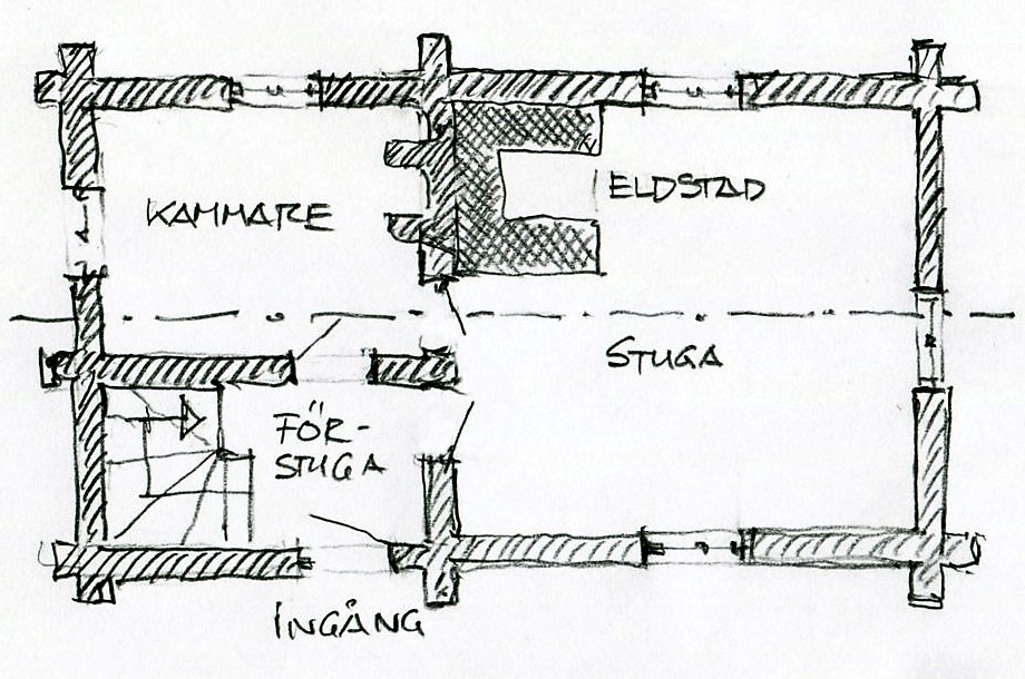 Precis så såg mormors hus ut. Jag hittar en planritning över en typisk ”enkelstuga”, en hustyp som existerat åtminstone sen medeltiden, och den stämmer precis, utom att köket hade spis och diskbänk istället för eldstad och att ingången alltså hade en förstukvist.