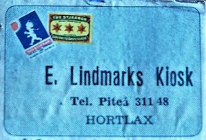 Under ett antal år hade mina morföräldrar nämligen en liten kiosk med tillhörande minigolfbana, som jag minns mycket väl. Den sköttes av en ung tjej och jag var säkert ofta där, för jag fick läsa hur mycket jag ville och det hände nog att jag fick lite godis också. På kvällen räknades dagskassan i köket. I en Hortlax-grannes blogg hittade jag bilden på en tändsticksask från kiosken.