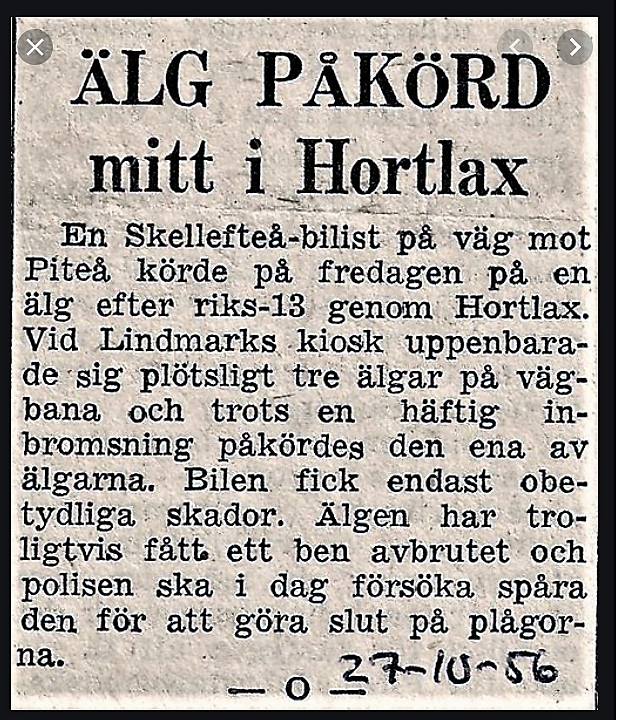 Mormors och morfars hus låg vid ”stora vägen”, dvs dåvarande Riks13/E4an, och vi varnades för bilarna – jag minns att en pojke hade blivit överkörd i närheten. Och i Pitetidningen ser jag en notis från 1956: Älg påkörd mitt i Hortlax (vid Lindmarks kiosk).