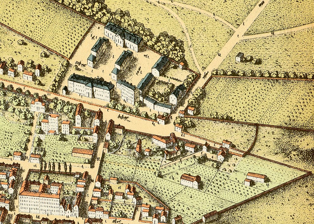 Ladugårdslandstull låg vid nuvarande Karlaplan, bilden nedan visar Heinrich Neuhaus panorama från 1870-talet. Landsvägen från landet går förbi de två vita grindstugorna ner till Stockholm.