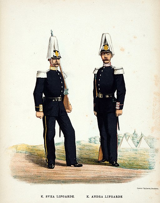 Bilden visar de stiliga uniformerna för Svea livgarde och Andra livgardet. Den finns i boken Svenska arméns och flottans uniformer, utgiven av P.B Eklund 1891.