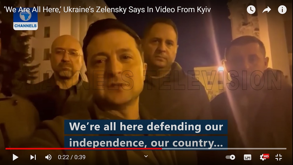Inför ockupationen hade han sagt till Putin: ”När du attackerar oss kommer du att se våra ansikten – inte våra ryggar, utan våra ansikten.” och på sociala medier sprids många filmer som visar hur obeväpnade ukrainare försöker stoppa ryska fordon, skruvar ner vägskyltar eller sätter ihop molotovcoctails. En bilföraren möter ryska soldater som fått slut på bränsle och frågar om de behöver bogseringshjälp tillbaka till Ryssland, och en gammal kvinna ger solrosfrön till en soldat att stoppa i fickan så att det kan växa solrosor på de ukrainska fälten där han kommer att dö. Solrosor är en symbol för Ukraina.