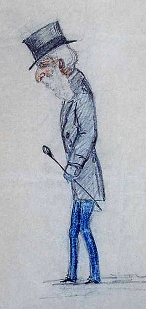 Överallt väckte han uppseende med sitt speciella utseende och sin hypereleganta klädsel. Håret var stort och silvervitt liksom de väldiga polisongerna och han var alltid iförd redingots, smårutiga byxor och stor, veckad sidenhalsduk med gnistrande briljantnål samt ett antal armringar och fingerringar. En hög grå cylinder toppade utstyrseln, och i knapphålet syntes en liten ros, som lär ha suttit i en bakom rockslaget dold liten flacon fylld med vatten…