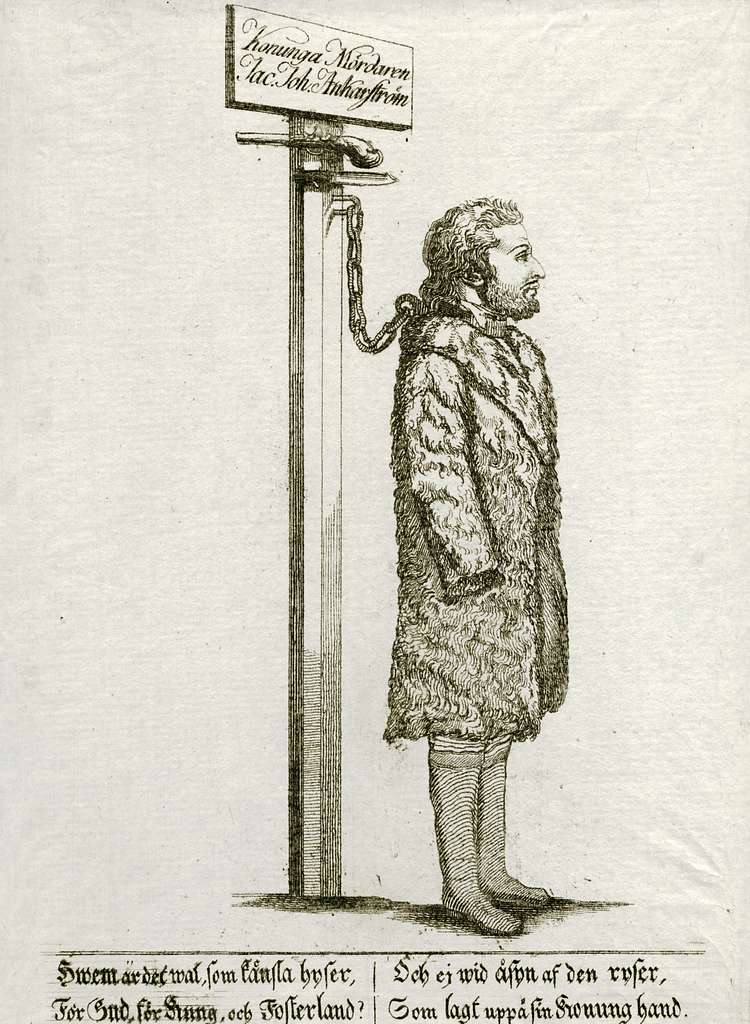 Bilden (från Picryl) visar Anckarström vid skampålen, med undertext: