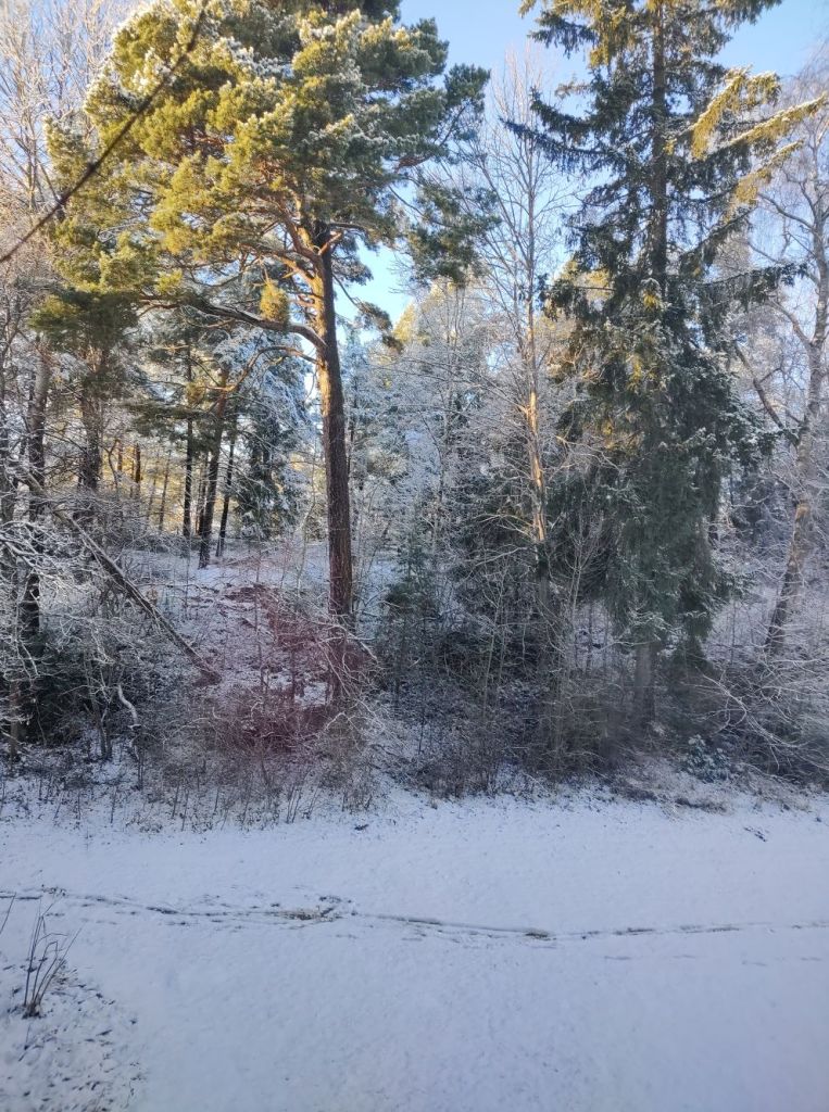 Och så lite vinter – dvs snö. Det har vi ingen nu, men i höstas såg det ut så här från köksfönstret just när solen började komma fram: