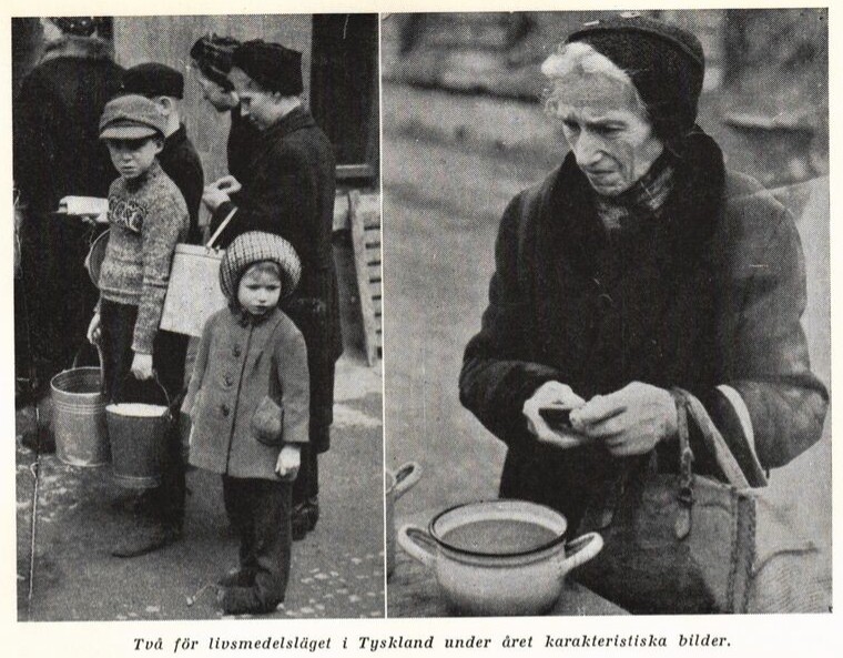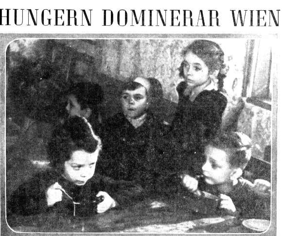I Wien är alla hungriga, skrev DN i mars 1946. Bildtexten löd: Det är svårt för de äldre syskonen att se på då de små äter svensksoppa.