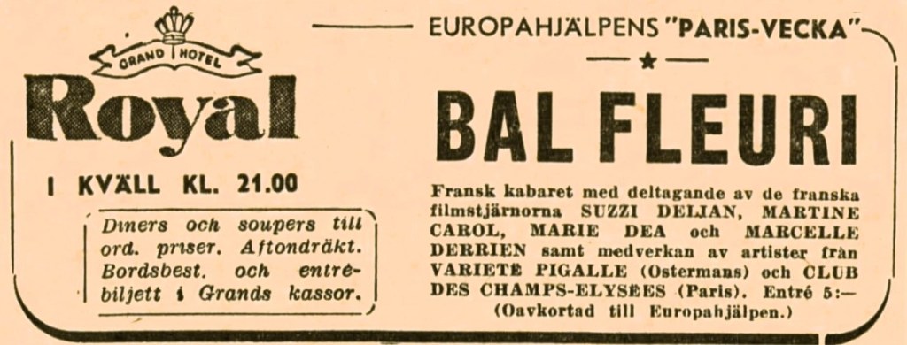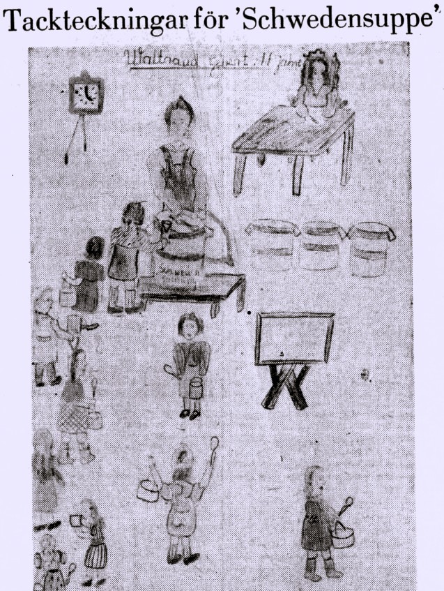 ”Schwedensuppe” kom man att kalla olika typer av hjälpinsatser, men från början var det den näringsrika soppa som Svenska Röda Korset och Rädda Barnen delade ut till undernärda barn i det sönderbombade Europa. Kaloriinnehållet kontrollerades noggrant, och soppan innehöll ofta mannagryn, havregryn, ärter, makaroner och grönsaker. Ett barn som fått russin i sin mjölk sa förskräckt: ”Mamma, det är vägglöss i den fina mjölken!” Han hade aldrig sett russin förr. Men vägglöss kände han väl till.